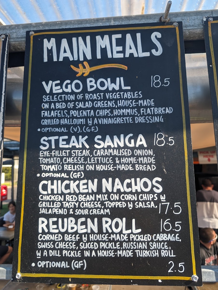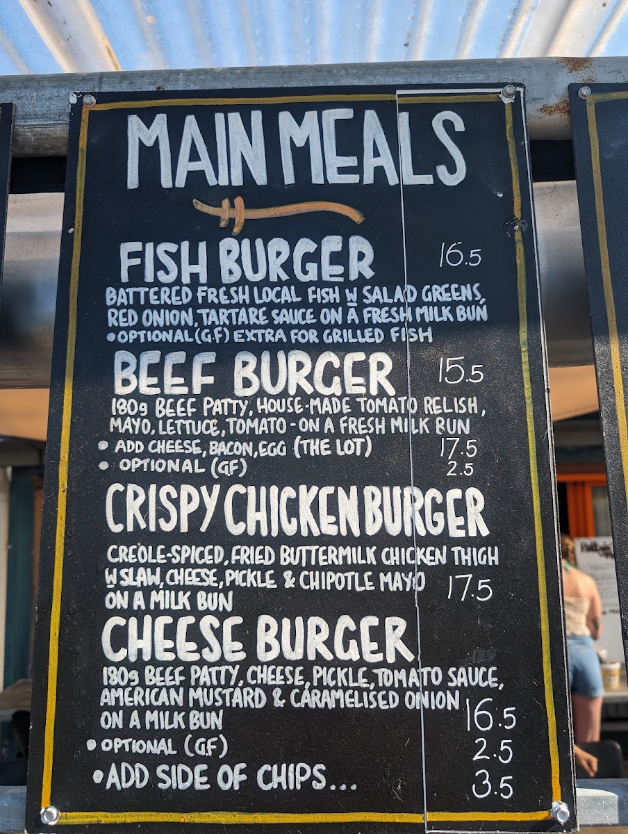 180g beef patty, cheese, American mustard, tomato sauce, pickle on a house milk bun. Add side of chips $2.50 or GF roll $2.50